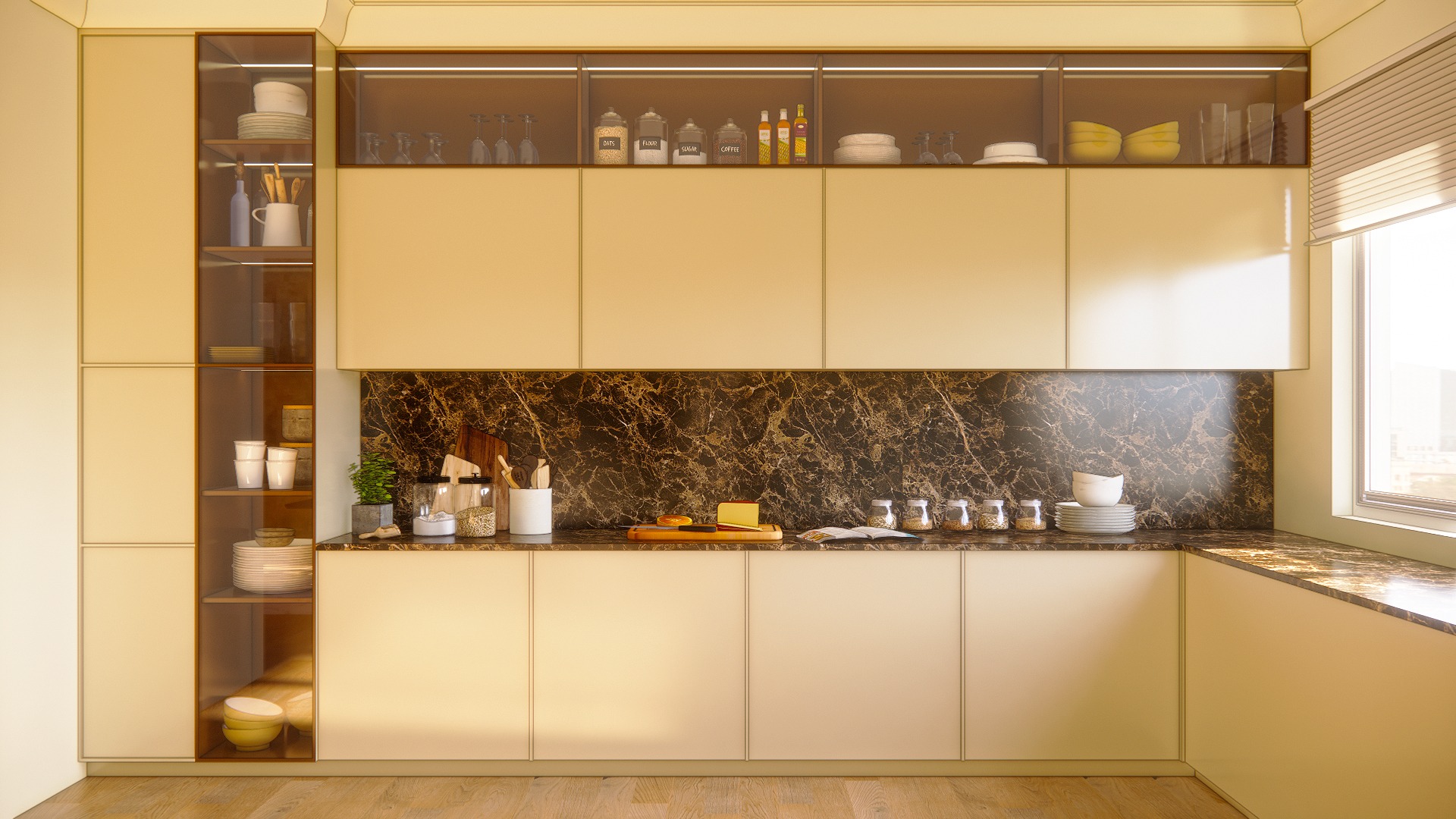 Adjacent to the dining area, the modern luxury kitchen seamlessly integrates functionality with aesthetic appeal. Elegant cabinetry, high-end stone countertops, and premium built-in appliances ensure the kitchen meets the demands of a busy lifestyle while maintaining a sophisticated look.