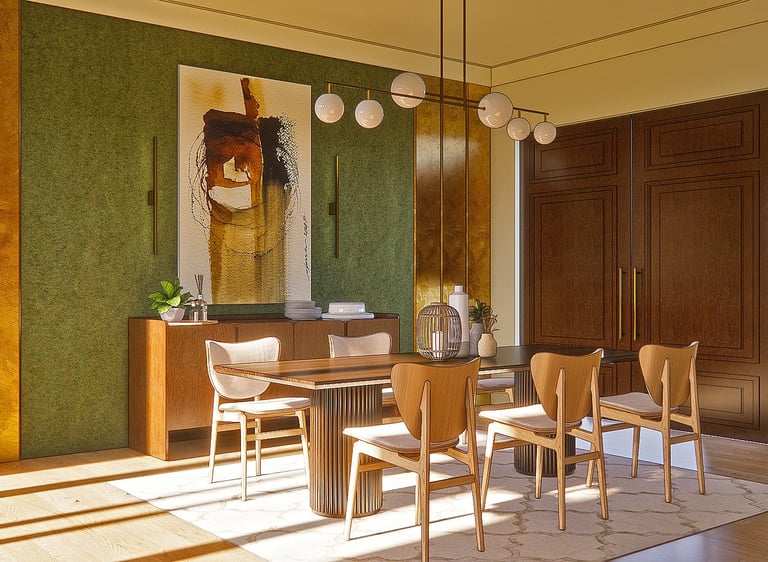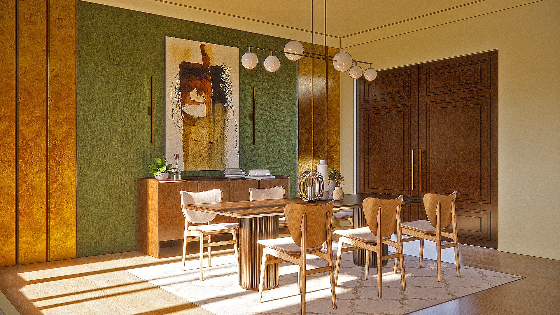 The dining area is a true statement of modern sophistication. A textured green and gold feature wall serves as a captivating backdrop, offering both luxury and warmth. The abstract wall art adds a dynamic focal point, complementing the natural tones of the room.