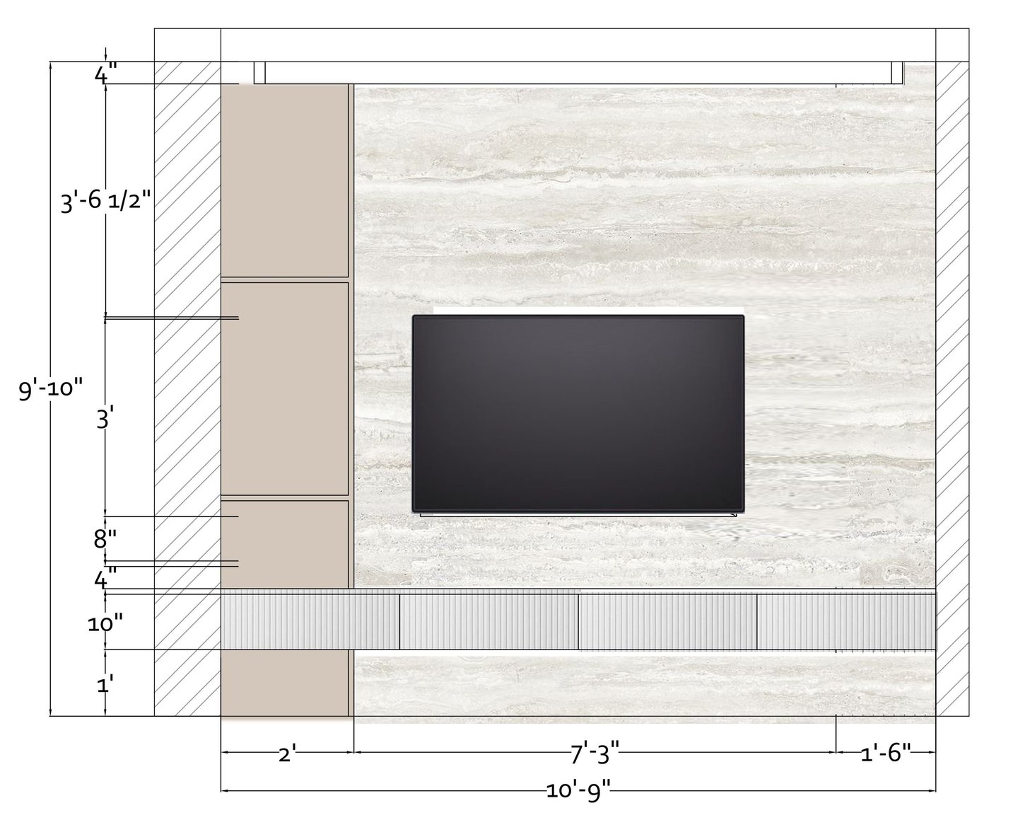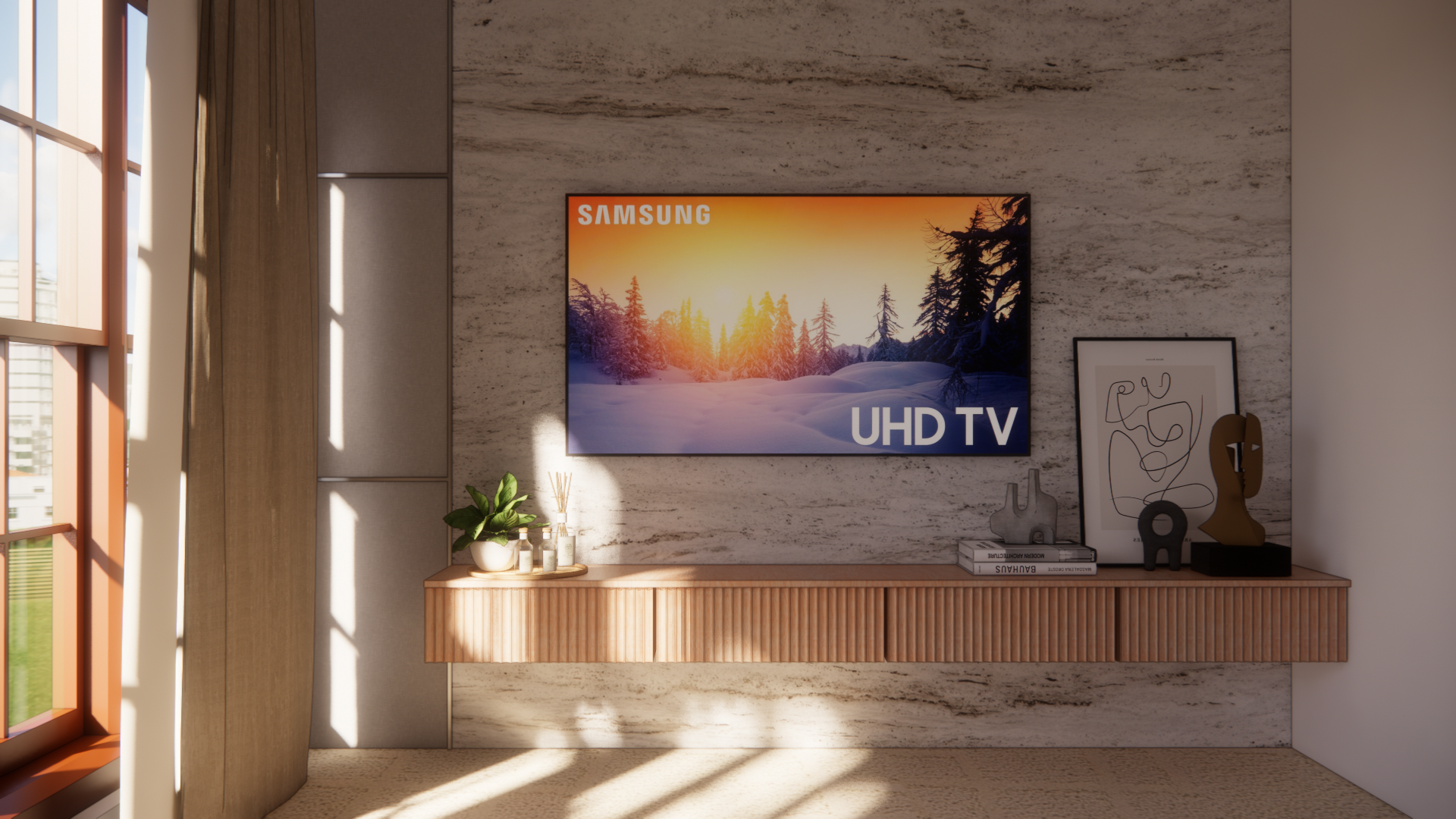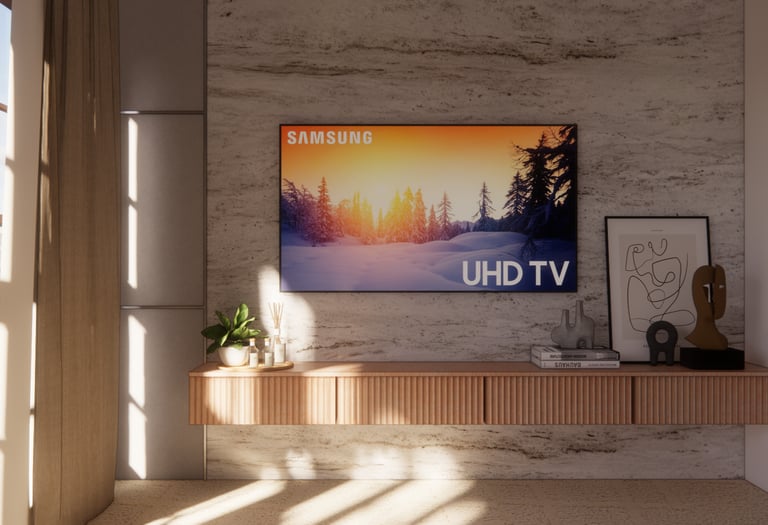 A beautifully balanced Scandinavian-inspired living room blending minimalist and contemporary design. A light beige sectional sofa with terracotta and neutral throw pillows offers comfort and elegance. A wooden slatted media cabinet adds warmth, embracing organic materials.