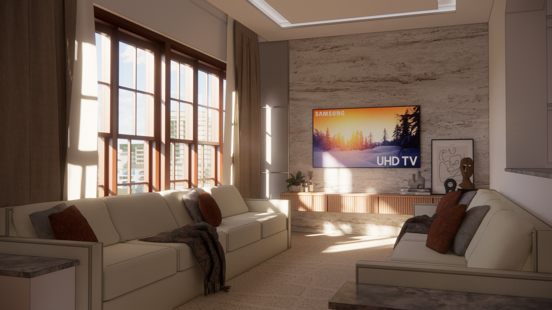 Large wooden-framed windows flood the space with natural light, highlighting textured light beige stone-like walls. The neutral palette, paired with warm earthy tones, creates a cozy, inviting atmosphere.